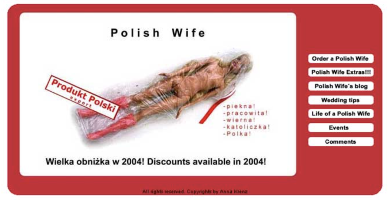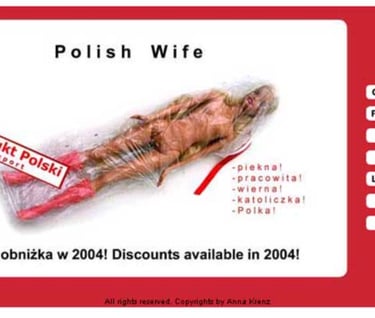 I am playing with stereotypes by using ironic forms and slogans common for the trade market. One can order a perfect Polish Wife online and I will deliver her in few days. After Poland joined the EU in 2004 there was a great SALE of Polish Wives. Now after Poland is in Shengen zone it is even easier to buy a Polish Wife due to the decrease of the administration procedures for marriages and travel abroad.