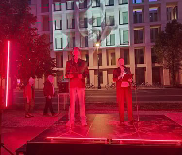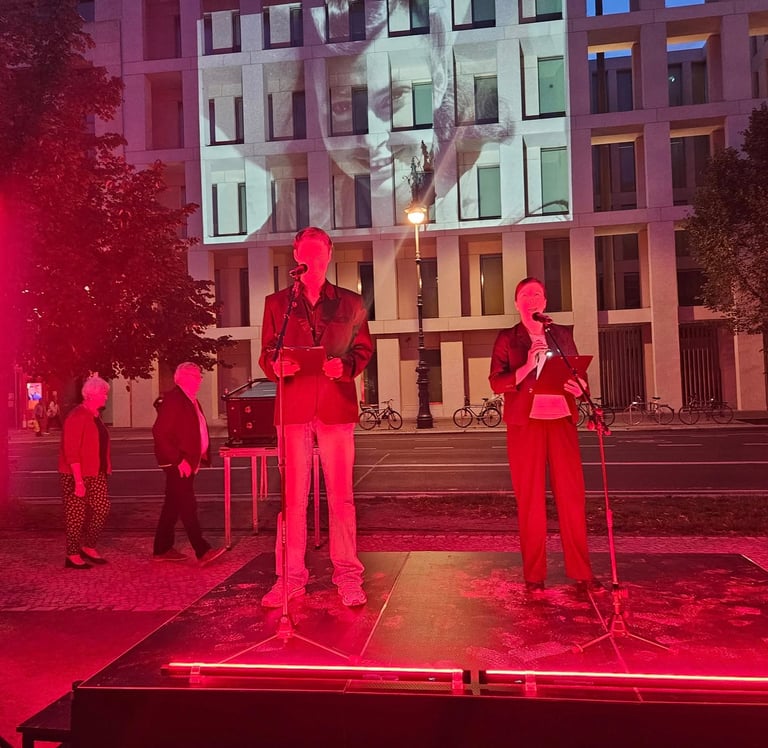 During the readings, we projected large-format portraits of insurgents onto the façade of the Polish Embassy (Unter den Linden 70), as well as the film „City of Ruins”, courtesy of the Warsaw Rising Museum. The façade was also illuminated with a large symbol of the Uprising — the so-called "Anchor", emblem of Fighting Poland. In recent years in Poland, nationalists and neo-Nazis have claimed the right to use historical symbols. With this event, I once again aimed to reclaim this narrative from right-wing fanatics — because history belongs to all of us.