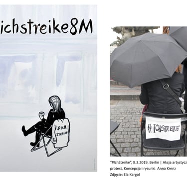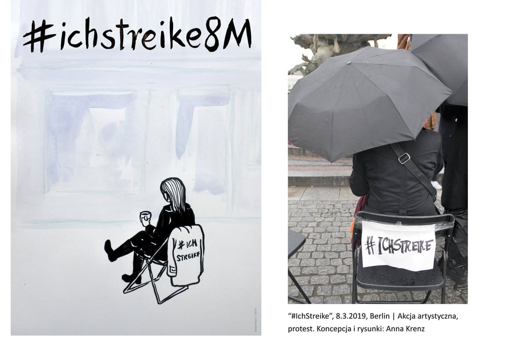 Jednym z pomysłów była akcja #IchStreike. Ponieważ w Niemczech nie wolno strajkować z powodów politycznych, a w Berlinie 8 marca stał się dniem wolnym od pracy — zaproponowałam symboliczną, zdecentralizowaną akcję, którą można przeprowadzić wszędzie, niskim kosztem i z mocnym efektem wizualnym. W pracy, na ulicy, w najmniej oczekiwanych (i niewygodnych) przestrzeniach publicznych ludzie mieli siadać na krzesłach z kartką „#IchStreike” / „#Strajkuję”. Akcja pod nazwą „5vor12” została przeprowadzona w wielu niemieckich miastach.