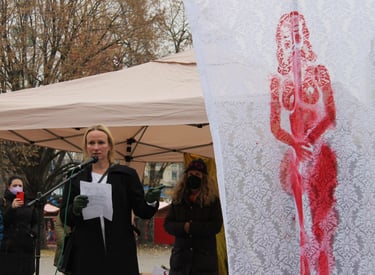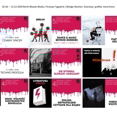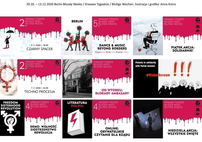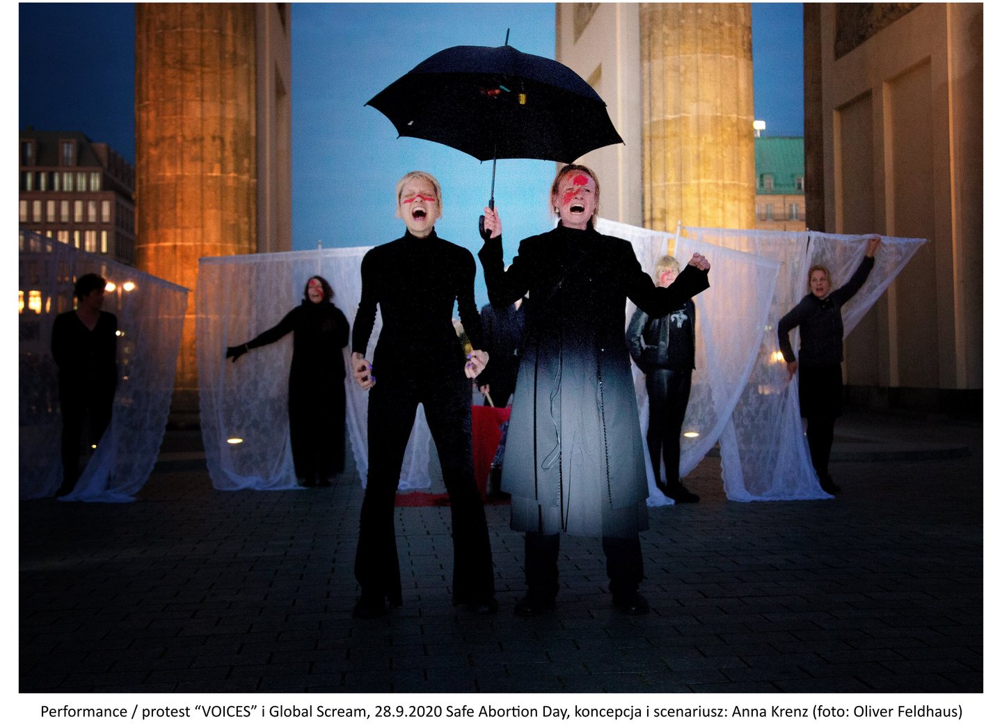 Protesty przeciwko wyrokowi Trybunału Konstytucyjnego kierowanego przez Julię P., które organizowałyśmy w Berlinie od 20 października do 13 grudnia 2020, nazwałam „Krwawymi Tygodniami”. W czasie pandemii koronawirusa, gdy całe życie publiczne zostało zatrzymane, a muzea, kina i galerie były zamknięte, jedyną dopuszczalną formą spotkań pozostały protesty. Dlatego w kilku z nich — właśnie w „Krwawych Tygodniach” — tworzyłam demonstracje jako performanse, spektakle. Berlińskie „Bloody Weeks” stały się w praktyce nieformalnym festiwalem sztuki i oporu.