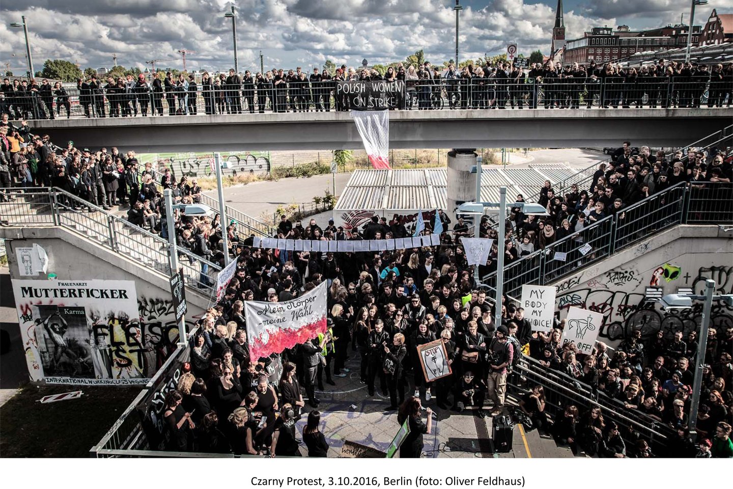 W Berlinie we trzy spontanicznie zorganizowałyśmy Czarny Protest, który zgromadził około 2000 uczestniczek i uczestników – wydarzenie, które wiele osób wciąż żywo pamięta. Podczas protestu przemawiały aktywistki, członkinie feministycznej grupy Ciocia Basia i autorka Margarete Stokowski. Premierę miał zespół Two Times Twice, a ich piosenka „Woman Scorned” stała się naszym nieoficjalnym hymnem. Tłum był zróżnicowany – kobiety, mężczyźni i dzieci z Polski, Niemiec i innych krajów. To był punkt zwrotny – największa jak dotąd demonstracja na temat praw polskich kobiet w Berlinie. Czarny Protest podkreślił siłę polskich kobiet i zapoczątkował nową falę międzynarodowej solidarności. Początkowo planowałyśmy zorganizować protest na ulicy na Warschauer Brücke, ale gdy zainteresowanie wzrosło do około 2000 osób, musiałyśmy znaleźć inne miejsce. Mieszkając w pobliżu, pomyślałam o schodach łączących stacje S-Bahn i U-Bahn. Ta przestrzeń wydała mi się naturalną sceną i ten pomysł stał się fundamentem wydarzenia. Zainspirowana konstrukcją schodów na Moście Warszawskim, potraktowałam demonstrację jako wydarzenie performatywne, przekształcając je w spektakl. Stałyśmy się reżyserkami, przemawiające osoby i wokalistki stały się "aktorkami", schody posłużyły za naszą teatralną scenę, a ubrany na czarno tłum stał się widownią i jednocześnie scenografią. Program przemówień i muzyki napisany jak scenariusz z dramaturgią, zakończył się pozytywnym i dodającym otuchy finałem.