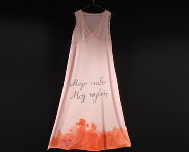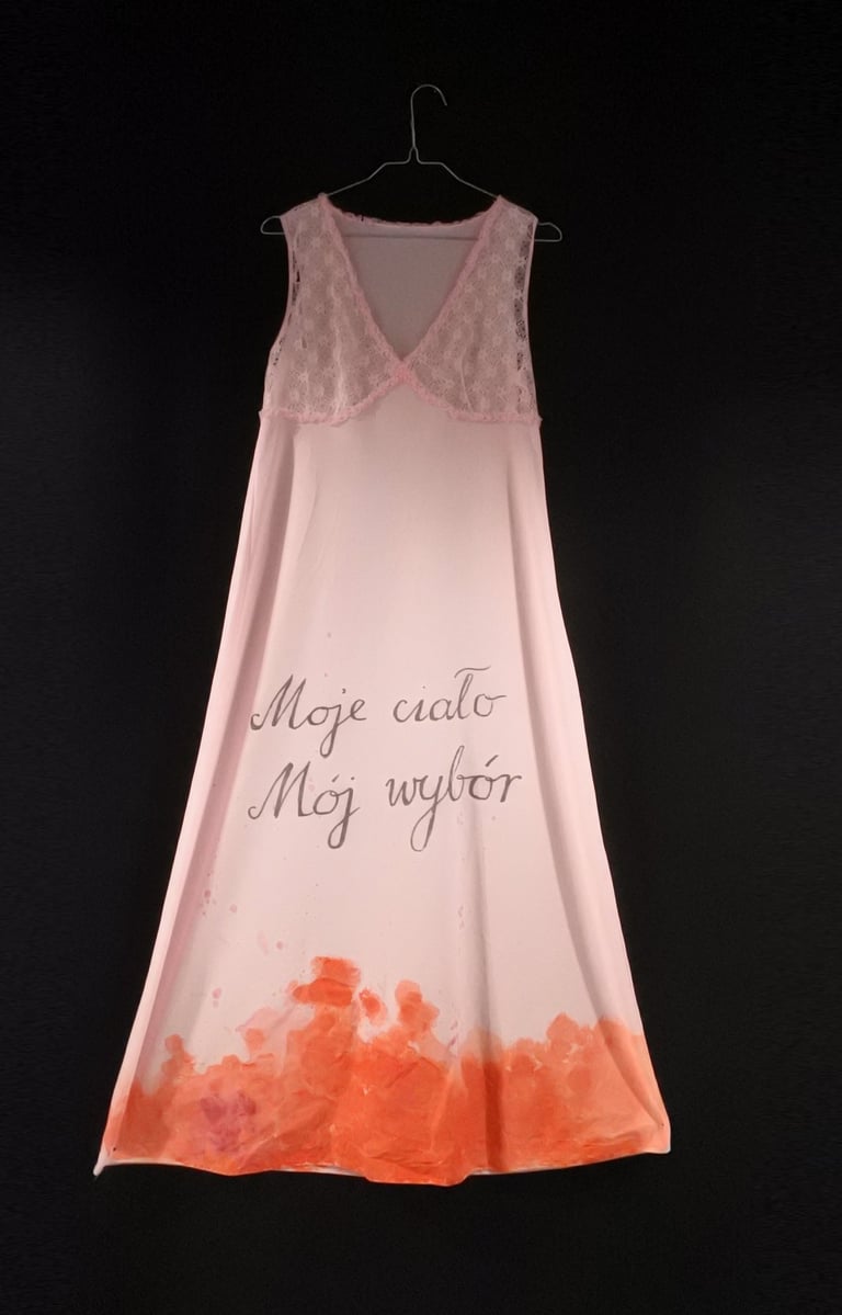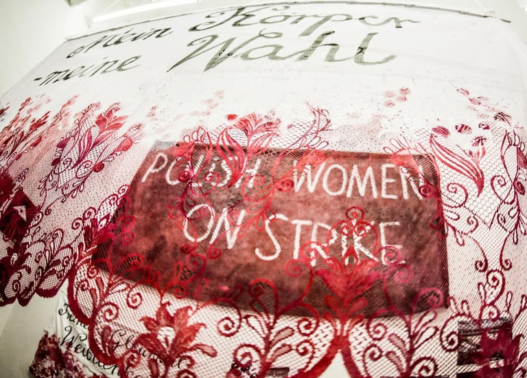 Od wielu lat w mojej praktyce artystycznej korzystam z tkanin — koronek i gotowych materiałów, zwłaszcza firan. Buduję z nich struktury przestrzenne. Podczas demonstracji na rzecz prawa do aborcji zaczęłam wykorzystywać koronkę również w działaniach aktywistycznych, malując hasła na koronkowych zasłonach. Prawo aborcyjne dotyczy przede wszystkim ciała. Nie istnieją inne przepisy, które ingerowałyby tak bezpośrednio w ludzkie ciało. Ciało kobiety.