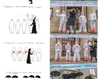Na ten protest zaproponowałam formę happeningu, w którym spontanicznie wzięły udział nasze koleżanki z BfsS oraz aktorka i aktywistka Mareike Wenzel. Idea była bardzo prosta, ponieważ happening obejmował chętne osoby z publiczności oraz organizatorki protestu. Narysowałam scenariusz (storyboard) by osoby, które zobaczyły go tuż przed demonstracją mogły szybciej nauczyć się swoich ról. Proste środki: nadmuchanie balonów i przebijanie ich przez protagonistkę (czarownicę); białe kostiumy z wcześniej pomalowanymi na czerwono nogawkami spodni, które uczestniczki później zdejmowały i rozkładały parasole. Te proste gesty okazały się skuteczne podczas protestu w formie „mówiących głów”.