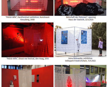 Jako artystka zawsze poruszałam w swojej twórczości kwestie polityczne i społeczne. Posługując się różnymi formami wyrazu i mediami – od rysunków i obrazów po wideo i performance – komentuję aktualną sytuację polityczną w Polsce, często posługując się ironią i humorem. Prace te były wystawiane w różnych galeriach w Berlinie, Polsce i na całym świecie, dla miłośników sztuki.
