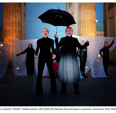 W Międzynarodowy Dzień Bezpiecznej Aborcji zorganizowałyśmy (Dziewuchy Berlin) demonstrację i performans pod Bramą Brandenburską. Botschaft der Polinnen* udostępniła swoją mobilną, artystyczną przestrzeń dla działania zatytułowanego „VOICES”.