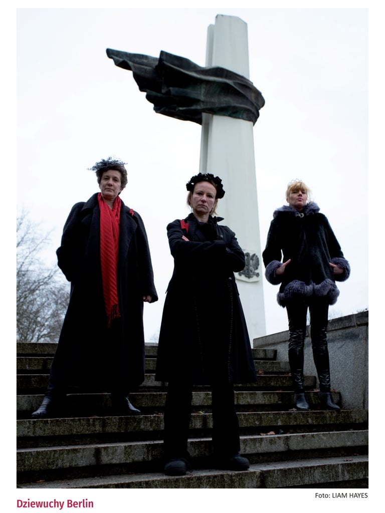 Performance odbył się na naturalnej „scenie” przy Pomniku Żołnierza Polskiego i Niemieckiego Antyfaszysty w Volkspark Friedrichshain. My nazywałyśmy go jednak nieformalnie Pomnikiem Walczących o Naszą i Waszą Wolność — tak, aby oddawał hołd nie tylko mężczyznom, ale także kobietom i osobom LGBT+, które również walczyły o wolność. Informację o tej zmianie nazwy i ożywieniu pomnika przedstawiam w wystawie „Wolność, Równość, Solidarność. Polskie Punkty Widzenia w Berlinie” (Stadtmuseum Berlin, do marca 2026).