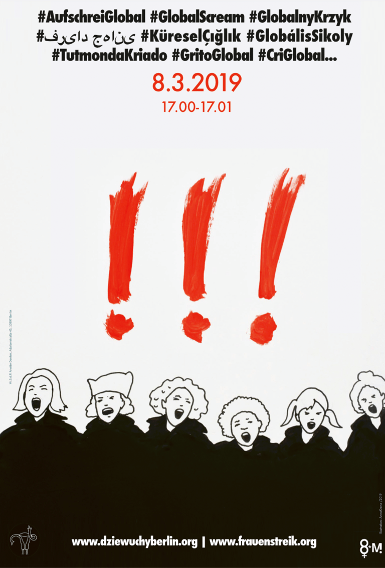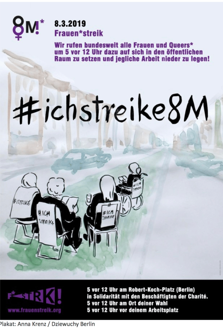 W 2019 roku w Berlinie powstała nowa inicjatywa feministyczna — Strajk Kobiet* (Frauen*streik). Od początku byłyśmy jej częścią. Podczas spotkania przygotowawczego Frauen*streik w lutym 2019 roku około 200 osób z całych Niemiec spotkało się w Berlinie, aby omówić plany na 8 marca, Międzynarodowy Dzień Kobiet. W Berlinie nie miało sensu organizowanie trzeciego marszu, trudno też było zdecydować, który marsz poprzeć i do którego się przyłączyć, a na dodatek Senat Berlina zrobił nam prezent na Dzień Kobiet — ogłosił go dniem wolnym od pracy. W związku z tym nie było również sensu organizować strajku.