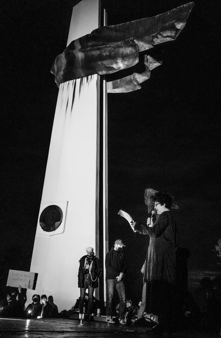 Podczas gdy my — z solidarności z kobietami w Polsce — walczyłyśmy o ich prawa reprodukcyjne i jednocześnie ożywiałyśmy to miejsce pamięci, w Bundestagu obradowała elitarna, lecz tajna grupa ekspertów debatujących o „rewitalizacji” polskich miejsc pamięci w Berlinie. Tymczasem my, polskie migrantki, aktywistki i artystki, po prostu to robiłyśmy. I robiłyśmy to za darmo. Dzięki naszym działaniom pomnik zyskał nowe życie, nowy sens — stał się żywą przestrzenią artystycznych i politycznych praktyk.