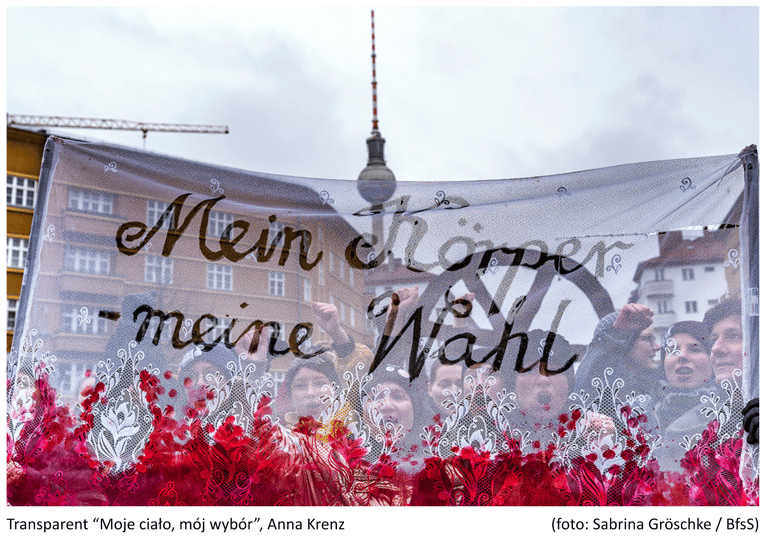 Nasz kolektyw jest częścią koalicji Bündnis für sexuelle Selbstbestimmung (Sojusz na rzecz seksualnej samostanowienia), z którą aktywnie działamy na rzecz prawa do seksualnej samostanowienia. W styczniu, po publikacji tzw. „kompromisu” dotyczącego paragrafu 219a, wzięłyśmy udział w kolejnym proteście organizowanym wspólnie z BfsS. Prawa kobiet w Niemczech dotyczą także nas, które tu mieszkamy.